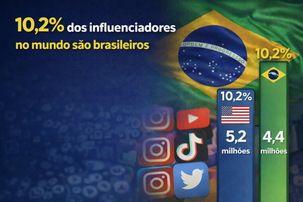 10,2% do número global de influenciadores são brasileiros, confirmando a posição do país como um dos mercados de creators mais maduros e comercialmente ativos do mundo O Brasil se consolida como uma potência global na creator economy. De acordo com o relatório State of Influencer Marketing 2026, da HypeAuditor, o