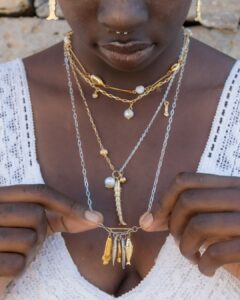 A marca trabalha com pedras naturais, cristais, pérolas, conchas, búzios, latão, aço inoxidável e prata, em produções artesanais, de baixa escala e personalizadas, transformando cada peça em uma história única. Entre suas coleções estão África, que celebra as raízes e símbolos do continente; Maarés, inspirada na força e na fluidez das marés da Bahia; e Maar.Eles, que propõe um olhar inclusivo e fluido sobre a joalheria contemporânea.